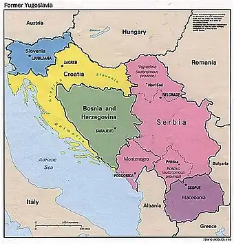 After the death of its leader Josip Broz Tito, Yugoslavia experienced a dysfunctional political system and economic calamity in the 1980s.[19] As communism was losing its potency, new nationalist leaders Slobodan Milošević in Serbia and Franjo Tuđman in Croatia came to power.[20] Slovenia and Croatia called for reforms and a looser confederation of the state in Yugoslavia but this call was opposed by the country's government in Belgrade.[21] On 25  June 1991, Slovenia and Croatia declared independence from Yugoslavia. A short armed conflict followed in Slovenia and the Croatian War of Independence escalated.[22] Macedonia also declared independence, which Yugoslavia granted without conflict.[23] The RAM Plan began to be implemented, laying the foundations for new borders of a "Third Yugoslavia" in an effort to establish a country where "all Serbs with their territories would live together in the same state".[24]