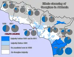 The ethnic cleansing of Georgians in Abkhazia,[4] also known in Georgia as the genocide of Georgians in Abkhazia (Georgian: ქართველთა გენოციდი აფხაზეთში, romanized: kartvelta genotsidi apkhazetshi),[5] was the ethnic cleansing,[6] massacres,[7] and forced mass expulsion of thousands of ethnic Georgians living in Abkhazia during both the 1992–1993 and 1998 Wars of Abkhazia by Abkhaz separatists and their allies.[8][9][10] Armenians, Greeks, Russians, and opposing Abkhazians were also killed.[11]