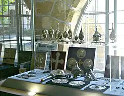The Cyprus Folk Art Museum was founded by members of the Society of Cypriot Studies in 1937 and housed in the premises of the Archbishop's Palace. With the construction of a new seat for the Archbishop of Cyprus in 1961, the Society approached the Archbishop, who graciously handed over the whole of the Old Archbishopric to the Society for its activities. From 1962 to 1964 extensive reconstruction of the building was carried out at great expense to the Society with the help of Archbishop Makarios III. In its early days, the museum was forced to close on three occasion during the 1955–1959 troubles.[4] In 1974 the museum closed again for over a year as a result of the invasion of the Turkish Army at which time collections were removed for safe keeping.[5] Subsequently, the roof of the building was in urgent need of repair and work carried out from 1990 after Archbishop Chrysostomos offered to cover the expenses. New exhibitions opened to the public in April 1996 on completion of the renovations.[6] In June 1999, the silk industry exhibitions were inaugurated in the first floor of the building.