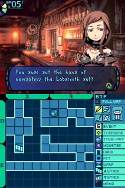 Etrian Odyssey requires that players maintain their own map by annotating (with the stylus) a small map displayed on the DS's touchscreen. The player is free to map accurately or haphazardly. However, the player cannot draw their own symbols, and must instead use the game's limited set of pre-designed symbols. The game also limits the number of symbols that can be used for each level map.
