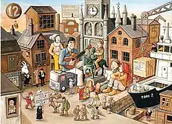 Together with singer and songwriter Finn Zetterholm, a group of first-graders from the Kungsätra School in Skärholmen sing songs. When opening a calendar window, they talk about the calendar window images.[2] On Christmas Eve, Finn and the children celebrate with most of the characters from the calendar in the square, and Dracula has a toothache.[3][4]