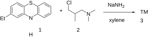 Etymemazine can be synthesized by SN2 alkylation of 2-ethylphenothiazine (1) with 1-dimethylamino-2-methyl-3-chloropropane (2) using sodamide as a base.[2][3]