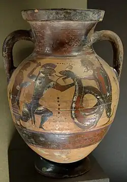 Euboean black-figure vase painting was influenced by Corinth and predominantly Attica. The distinction of Boeotian from Attic products is not always easy. Scholars assume that the bulk of the finds was produced in Eretria. Especially amphorae, lekythoi, hydriai and plates were painted. Large format amphorae were normally used for mythological imagery, such as the adventures of Herakles and the Judgement of Paris. Very large amphorae, derived from shapes of the 7th century, had conical lips and often showed images related to weddings. They were probably funeral vases, made especially for children who died before marriage. Typical of Eretrian black-figure pottery is the restricted use of incision and the regular use of white paint for floral ornaments. Apart from images orientated on Attic tradition, there was also wilder imagery, such as the rape of a deer by a satyr, or Herakles with centaurs and daimons. Vases of the Dolphin Class were originally considered Attic by scholars, but are now recognised as Euboean. However, their clay does not resemble that from any known Eretrian sources, suggesting that they were made in Chalkis. For some black-figure styles, the origin is disputed. Thus, Chalkidian vase painting was initially considered Euboean, but is now usually assumed to be from Italy.
