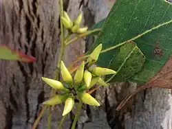 The flowers are arranged in groups of seven to fifteen or more, the groups on a flattened or angular peduncle 7–15 mm (0.3–0.6 in) long, the individual flowers sometimes on a pedicel up to 8 mm (0.3 in) long, or sessile. The buds are cone-shaped, the floral cup hemispherical 2–3 mm (0.08–0.1 in) long, the operculum conical, 7–9 mm (0.3–0.4 in) long and about 4 mm (0.2 in) wide at the join. Flowering occurs between November and January and the fruit is a woody, hemispherical capsule 2–5 mm (0.08–0.2 in) long and 4–6 mm (0.16–0.24 in) wide on a pedicel 1–5 mm (0.04–0.2 in) long. There are three or four upward-pointing valves on the top of the fruit.[3][4][5]