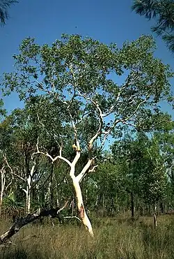 Eucalyptus apodophylla, commonly known as whitebark,[3] is a small to medium-sized tree that is endemic to northern Australia. It has smooth, powdery white bark, broadly lance-shaped to egg-shaped adult leaves, flower buds in groups of seven, white flowers and hemispherical to conical fruit.
