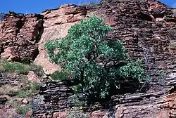 Tropical red box is found on rocky sites or in rock fissures in the Kimberley region of Western Australia growing in sandy skeletal soils over sandstone or quartzite.[3] It is also found in the north west of the Northern Territory from south of Darwin, Northern Territory extending south west from the Tabletop Range through the Victoria River catchment area to the Western Australian border. Its usual habitat is on sandstone plateaus and ridge tops.[4]
