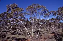 This eucalypt is found on limestone plains on the south western Goldfields-Esperance region of Western Australia growing in sandy loam or red sand soils.[3] It has a limited range around Balladonia and Zanthus where it forms part of low woodland communities.[2]
