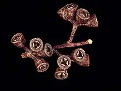 The flower buds are arranged in groups of seven, nine or eleven in leaf axils on an unbranched peduncle 8–22 mm (0.31–0.87 in) long, the individual buds on a pedicel 3–6 mm (0.12–0.24 in) long. Mature buds are oval to pear-shaped, 4–7 mm (0.16–0.28 in) long and 3–4 mm (0.12–0.16 in) wide with a conical to rounded or beaked operculum. Flowering occurs from February to April and the flowers are white. The fruit is a woody cup-shaped to bell-shaped capsule 4–6 mm (0.16–0.24 in) long and 5–7 mm (0.20–0.28 in) wide with the valves at rim level or slightly beyond.[2][3][4][5][7]