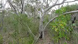 Eucalyptus haemastoma, commonly known as scribbly gum,[2] is a species of tree that is endemic to the Sydney region. It has white or silvery grey bark, lance-shaped or curved adult leaves, flower buds in groups of between nine and fifteen, white flowers and conical or hemispherical fruit. It is one of several eucalypts with prominent and differing insect scribbles in the bark, caused by the larvae of Ogmograptis, (and in the case of E. haemostoma - probably O. racemosa).[3]
