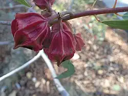 The mallee typically grows to a height of 1.5 to 8 metres (5 to 26 ft) that has rough fibrous bark on the trunk with smooth bark above. It produces white-cream to red-pink flowers between April and October.[1] The flower buds and fruits are large and ribbed or “winged” and are found in pendulous groups of three.[2] It has variable form ranging from a small compact shrub-like habit to a taller more irregular habit. The flowers are highly decorative usually with pink-red buds that open to cream-yellow flowers that are around 3 centimetres (1.2 in) across.[3] The dull, grey-green, thick and concolorous adult leaves have a disjunct arrangement. The leaf blade has a narrow lanceolate to broad lanceolate and is basally tapered. The buds are globose and rostrate, with a calyx calyptrate that sheds early. The fruits are hemispherical with a raised disc and exserted valves.[4][5]