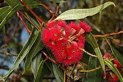 Eucalyptus lansdowneana, commonly known as the crimson mallee or the red-flowered mallee box,[2] is a species of slender stemmed, straggly mallee that is endemic to a restricted area of South Australia. It has rough, fibrous or flaky bark at the base, smooth, grey over creamy-white bark, lance-shaped adult leaves, flower buds in groups of seven, crimson flowers and barrel-shaped fruit.