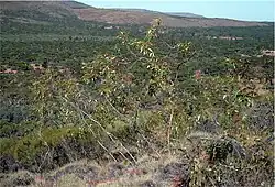 Crimson mallee is restricted to the south western part of the Gawler Ranges where it grows in mallee vegetation on rocky outcrops and hilltops.[3][4]