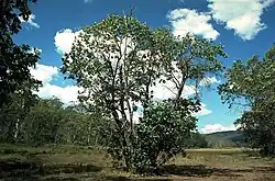 Eucalyptus neglecta, commonly known as Omeo gum,[3] is a species of small tree that is endemic to a small area of Victoria, Australia. Older plants have rough, fibrous bark on the trunk, otherwise smooth grey to brownish bark, a crown of mostly lance-shaped, egg-shaped or oblong leaves arranged in opposite pairs, flower buds in groups of between seven and fifteen, white flowers and cup-shaped or conical fruit.