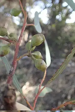 Eucalyptus neutra, commonly known as the Newdegate mallee,[2] is a species of mallee that is endemic to the south-west of Western Australia. It has greyish bark, lance-shaped adult leaves, flower buds usually in groups of seven, pale yellow to white flowers and barrel-shaped to shortened spherical fruit.