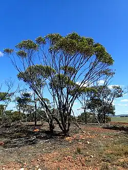Newdegate mallee is found on plains and hillsides, between ridges and on road verges from near Lake King towards Corrigin and Jerramungup the Avon Wheatbelt, Coolgardie, Esperance Plains and Mallee biogeographic regions of Western Australia where it grows in gravelly sandy-clay-loam soils.[2][3]