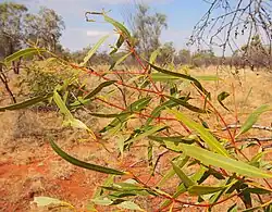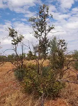 In the Northern Territory the species forms part of the upper shrub layer in mixed woodland communities on sandplains often found with Corymbia opaca, Hakea macrocarpa and Atalaya hemiglauca in the overstorey with Acacia coriacea and Streptoglossa odora in the shrub layer with a ground layer beneath including grasses such as Triodia pungens, Aristida holathera, Aristida contorta and Astrebla pectinata.[10] In the Pilbara of Western Australia it is found in low tree woodlands with Corymbia hamersleyana over Acacia tumida var. pilbarensis shrubland with Templetonia hookeri and Acacia adoxa over Triodia epactia hummock grasses.[11]