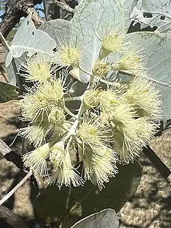 Eucalyptus pruinosa, commonly known as silver box, silver leaf box, apple box or smoke tree,[2] is a species of tree or a mallee that is endemic to northern Australia. The Jaminjung peoples know the tree as yarrirra or jarnbiny, the Jaru as wararn and the Wagiman as wararn.[2] It has rough, fibrous to flaky bark on the trunk and branches, a crown composed of juvenile, glaucous, heart-shaped to broadly elliptical leaves arranged in opposite pairs, flower buds arranged in groups of seven on the ends of branches, creamy white to pale yellow flowers and cylindrical to conical fruit.