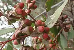 The tree will typically grow to a height of 2 to 7.5 metres (7 to 25 ft) and has white or grey-brown smooth bark and a slender habit. It blooms between July and February producing circular conflorescences with yellow fine flowers.[2] The fruit or capsule are ribbed and barrel-shaped finishing with a point at one end. They are 2.3 to 4 centimetres (0.9 to 1.6 in) in length and 1.8 to 2 centimetres (0.7 to 0.8 in) wide with a thick rim, descending disc and three enclosed valves. The capsules are a red-brown colour that darken with age.[3]