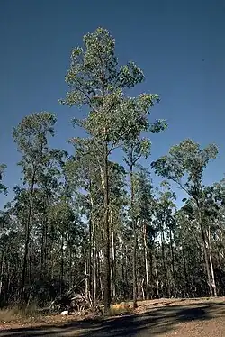 The square-fruited ironbark grows in open forest on poorly-drained soil on slightly sloping ground between Casino and Grafton in northern New South Wales.[2][3][4]