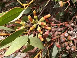 The flower buds are arranged in leaf axil in groups of seven on a flattened, unbranched peduncle 13–33 mm (0.51–1.30 in) long, the individual buds sessile or on pedicels up to 5 mm (0.20 in) long. Mature buds have an elongated ovoid shape and are 12–28 mm (0.47–1.10 in) in length and 4–7 mm (0.16–0.28 in) wide with a horn-shaped operculum that is up to 2.5 times as long as the floral cup. Flowering occurs from September to January and the flowers are creamy white. The fruit is a woody, conical to almost barrel-shaped capsule 8–13 mm (0.31–0.51 in) long and 7–10 mm (0.28–0.39 in) wide on down-turned to spreading peduncles. There is a descending disc and three to four valves at rim level. The seeds are oval, black to brown and 7–20 mm (0.28–0.79 in) long.[4][5]