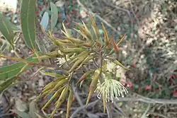 Eucalyptus varia is a mallee that typically grows to a height of 7 m (23 ft), forms a lignotuber and has smooth grey bark. Adult leaves are the same shade of dull bluish green on both sides, narrow lance-shaped, 48–90 mm (1.9–3.5 in) long and 9–20 mm (0.35–0.79 in) wide tapering to a petiole 8–15 mm (0.31–0.59 in) long. The flower buds are arranged in leaf axils in groups of nine or eleven on an unbranched peduncle 10–17 mm (0.39–0.67 in) long, the individual buds on pedicels 3–5 mm (0.12–0.20 in) long. Mature buds are an elongated spindle shape, 16–27 mm (0.63–1.06 in) long and 2–5 mm (0.079–0.197 in) wide with a horm-shaped operculum that is about three times as long as the floral cup. Flowering occurs from July to September or October and the flowers are yellow. The fruit is a woody, barrel-shaped to cylindrical capsule 7–11 mm (0.28–0.43 in) long and 5–7 mm (0.20–0.28 in) wide with the valves at or below rim level.[2][3][4]