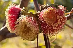 Eucalyptus youngiana, commonly known as large-fruited mallee, Ooldea mallee and yarldarlba,[2] is a species of mallee, less commonly a tree, that is native to arid and semi-arid areas of southern Western Australia and South Australia. It has rough, fibrous bark on some or all of the trunk, smooth bark above, lance-shaped adult leaves, flower buds in groups of three, red, pink or bright yellow flowers and short, broad, conical fruit.