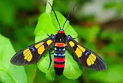 Euchromia polymena is a species of day flying moth of the subfamily Arctiinae. These moths are vibrantly coloured and look like wasps so known as Wasp moth[1] or Painted handmaiden moth.[2] It was described by Carl Linnaeus in his 1758 10th edition of Systema Naturae. It is found in India and south-eastern Asia, as well as on Sumatra, Java, Sulawesi, Peninsular Malaysia, Borneo and the Philippines.[3] It is also present in the northern part of Western Australia and the Northern Territory.