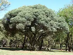 The plants carry a dense canopy of simple leaves of a dull grey-green colour and a rigid, leathery lineament.[3] Variation in terms of colour, shape, texture and arrangement is however considerable.[3] Foliage colour varies from a greyish green to distinctly blue, and the leaf shape varies from lanceolate to obovate.[3] New branches and foliage are covered in rust-brown scales (gland granules),[2][9] while mature leaves may be hairy or glabrous.[8] Leaves may be opposite, sub-opposite or rarely alternate.[2] The slender petiole is 1.5 to 2 mm long,[2] and the leaves measure up to 5 x 1.5 cm.[8] The leaf veins are clear and transparent against light, unlike the opaque venation of Wild olive trees.[3][7] Leaves may also resemble those of the Natal guarri, a species of generally lower altitudes, but the latter's leaves have a finely hairy stalk.[4]