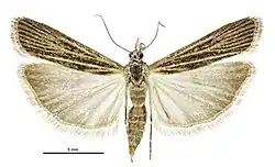 ♂. 23-24 mm. Head and thorax light grey more or less mixed with whitish. Palpi 3, light grey, white towards base beneath. Antennal ciliations 2⁄3. Abdomen pale greyish-ochreous. Forewings elongate, very narrow towards base, gradually dilated posteriorly, apex obtuse, termen slightly rounded, rather oblique; ochreous-grey, usually more or less suffused with whitish on veins, interneural spaces more or less suffusedly sprinkled with dark fuscous; claviform indicated by a small spot of dark-fuscous suffusion : cilia white, with a grey line. Hindwings 1+1⁄4 without long hairs in cell; light grey, paler towards base : cilia white or in one specimen whitish-ochreous, with faint grey line.[3]