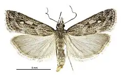 ♂ 16 mm. Head, thorax grey mixed white. Palpi dark grey, apical edge white. Forewings elongate-triangular, termen slightly rounded, oblique; grey, costal and dorsal thirds suffusedly irrorated white; an irregular streak of black irroration beneath cell from base to end; a slenderer black streak in cell from middle to end, terminating in a white dot on angle of cell, and five rather irregular black lines on veins to termen, black dots on ends of terminal veins: cilia whitish-grey, a light grey subbasal line. Hindwings light grey; cilia pale grey, a darker subbasal shade.[3]