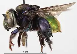 Eufriesea purpurata is a species of eusocial orchid bee common in northeastern South America, particularly in the Amazon basin.[1][2] It is an important pollinator of various wild plants, and it is noted for its attraction to various synthetic compounds used by humans, including some insecticides. In the late 1970s, males of the species pestered an indigenous Amazonian community whose palm-leaf houses had been sprayed by the government with DDT, which the bees found attractive.