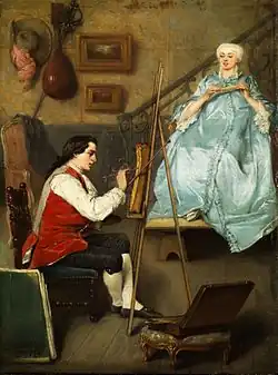 Eugène Fichel entered the École des Beaux-Arts in 1844 and became a pupil of Hippolyte Delaroche and Michel Martin Drolling,[1] but painted very much more under the inspiration of Jean-Louis-Ernest Meissonier, whose exquisite handling is suggested in numerous small canvases of his which by their refined technique and vivid action recall the characteristic intensity and directness of composition which belong to the painter of "Friedland." His students included Jeanne Samson, who first exhibited at the Salon in 1869,[2] and whom he later married.[3]