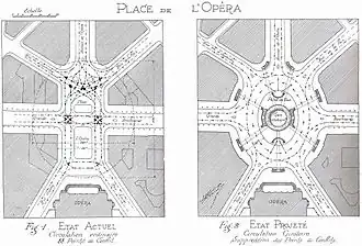 For the Place de l'Opéra he added aesthetic considerations to concerns over the problem of motor traffic and motoring, regretting that it was impossible to see the main facade of the Opera building as a whole.[50] He, therefore, proposed to double the width of the square and give it an almost circular form, slightly oval: the oval would be 120 by 136 metres (394 by 446 ft). This eccentricity would be small enough not to slow down the circular movement by bends with too narrow a radius. In the middle of the square, a large circular funnel 20 metres (66 ft) in diameter would provide light and air to radiating underground pedestrian galleries and the Metropolitan station. Access to the underground passages and the station would be via two central stairs and seven stairs around the perimeter.[50]