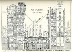 Hénard presented a paper at a conference in 1910 in London on the "City of the Future" that gave a visionary, futurist outline of a high-technology designed city in which the use of private aircraft was widespread.[20] Although they were Utopian at the time, many (but not all) of his suggestions later turned into reality.[34] His streets included conduits for gas, electricity, compressed air, drinking water, pneumatic tubes for letters, telephone lines and so on. There were bathrooms with hot and cold water on every floor.[35] Vacuum powered wall conduits would remove smoky or polluted air from the apartments. Garbage would be thrown down tubes into bins below grade, and service carts would carry it away on rails below the street.[36]