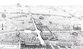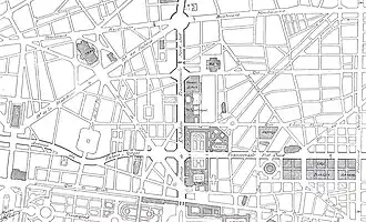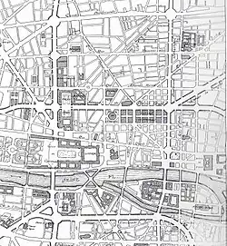 Anticipating growing volumes of traffic, Hénard was in favor of a network of ring roads around the city center linked by arterial roads crossing the city.[42] He presented a project for a nouvelle grande-croisée Est-Ouest de Paris ("new major east-west crossing of Paris") in 1904.[43] In his plan, two broad avenues would intersect at right-angles at the Palais-Royal, dividing Paris into four districts.[44] They would join in a roundabout, cutting into the west side of the Palais-Royal.[25]