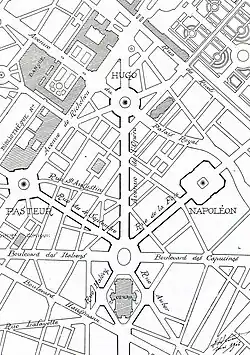 Hénard was preoccupied with finding solutions to the growing traffic problem in Paris, and devoted much of his career to this subject.[20] He prepared many studies and plans for improving the road system in Paris while preserving important buildings and monuments.[21] Hénard wanted to develop better radial thoroughfares, and to take the opportunity presented by demolition of the old city fortifications to build a ring road and new parks and housing.[20] The new housing units would have a staggered arrangement so as to maximize the light received by each apartment and to create more recreational space. He received strong support from organizations such as the Musée Social, and from other urban planners, but was opposed by real estate investors who feared the impact of his planned 75,000 apartment units. After World War I (1914–1918) most of the fortifications area that was to be used for his projects was instead sold in independent parcels to various developers.[22]