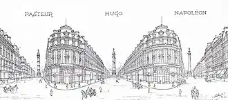 Looking north from the square there would be three views: along the Rue de la Paix to the column of the Grand Army, along the Avenue de l'Opéra, with the distant dome of one of the pavilions of the Louvre, and along the rue du 4-Septembre, with a more confused appearance. Hénard proposed to balance the perspectives by adding two columns the same height as the Vendôme column, one in the axis of the Avenue de l'Opera, the other in the rue du 4-September. He proposed to erect a column to the glory of arts topped with a statue of Victor Hugo, and another to the glory of science dedicated to Louis Pasteur.[51] The Arts column would be on the axis of the Avenue de l'Opera, which leads to the Théâtre-Français and the Louvre. The Sciences column would be on the axis of the rue du 4-September leading to the National Library and the Conservatory of Arts and Crafts.[52]