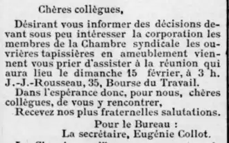 - ^ Collot, Eugénie (15 June 1894). "Une protestataire impénitente". Le Petit Troyen. p. 2.