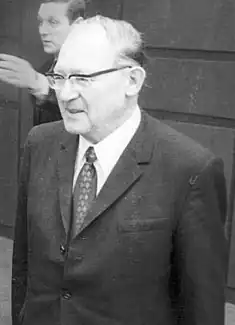 At Buchenwald, Kogon spent part of his time working as a clerk for camp doctor Erwin Ding-Schuler, who headed up the typhus experimentation ward there. According to Kogon's own statements, he was able to develop a relationship bordering on trust with Ding-Schuler, after becoming his clerk in 1943. In time, they had conversations about family concerns, the political situation and events at the front. According to Kogon, through his influence on Ding-Schuler, he was able to save the lives of many prisoners,[3][4] including Stéphane Hessel, Edward Yeo-Thomas, and Harry Peulevé by exchanging their identities with those of prisoners who had died of typhus.[5] In early April 1945, Kogon and the head prisoner nurse in the typhus experimentation ward, Arthur Dietzsch, found out from Ding-Schuler that their names were on a list of 46 prisoners whom the SS wanted to execute shortly before the expected liberation of the camp. Ding-Schuler saved Kogon's life at the end of the war by arranging to hide him in a crate, then smuggling him out of Buchenwald[6] to his own home in Weimar.[7]
