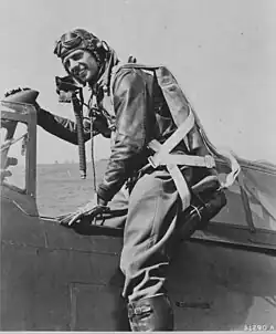 Following the completion of flight training, he was assigned to the 62nd Pursuit Squadron of the 56th Pursuit Group. The unit later was renamed to the 62nd Fighter Squadron of the 56th Fighter Group and was equipped with the Republic P-47 Thunderbolt. He was deployed with the group to England in January 1943 and arrived at RAF Kings Cliffe in January 1943. Flying the P-47, he shot down his first enemy aircraft in aerial combat on November 11 and on November 26, he shot down two rocket-carrying Messerschmitt Bf 110s that was attempting to attack a formation of American bombers returning from a mission over Germany. He shot down his fourth enemy aircraft on December 20 and became a flying ace on February 6, 1944, after shooting down his fifth enemy aircraft.[2][3][4]