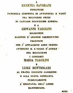 - ^ The notice, or epigrafia, was published in the name of Maria Tadolini, the bridegroom's sister and her husband, Luigi Bottrigari. It is reproduced in Rambelli (1853), p. 92