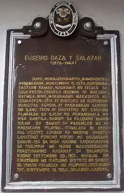 Daza was born November 15, 1870, in Borongan, Samar, to businessman Juan Cinco Daza and his wife, Doña Magdalena Campomanes Salazar. Daza had one younger brother named Inigo. Through Doña Magdalena's family, the Salazar's, Daza was a member of the Principalía (nobility) of Samar, giving him the title of Don.[6] Daza earned a degree in education in 1888, at the Jesuit Escuela Normal de Maestros in Manila. He married Carolina Cinco, of Catbalogan, Samar, and later fathered seven children with her. In 1895, he established his school under Spanish administration in Borongan, becoming the first maestro (teacher) in Samar.[1][7]