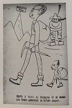 Gentili took part in the Italian resistance movement and fought alongside the Partisans in the Aosta Valley (in northwestern Italy at the border with France).[2] He was denounced in June 1944, arrested and imprisoned in Turin. He was released in a matter of weeks, after Gentili's father and girlfriend were able to raise the 30,000 lire needed to bribe the police superintendent in Turin to turn him free.[17] In the winter of 1944/45 he managed to elude the Nazi roundups and crossed the Alps into France to safety. In early 1945, he returned to Italy with the Allied forces, going first to Rome.[18] His sketches from that period chronicle different aspects of the partisans' operations.