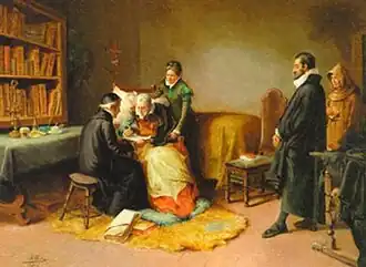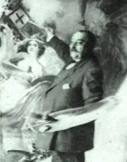 During this time, he received another commission for murals at the Círculo de Recreo de la Victoria (a private club) in Valladolid.[3] A few of these in the casino were apparently somewhat suggestive in nature and included a version of Leda and the swan with friars. This was in addition to more traditional Classical scenes executed at private residences. In 1907, the Diputación of his home town engaged him to create religious murals at the orphan's home and provincial hospice. In 1911, as a result of that work, he was commissioned to paint historical murals in the lobby of the Diputacion's governmental palace.[1] All but one of these were severely damaged by a fire in 1966.