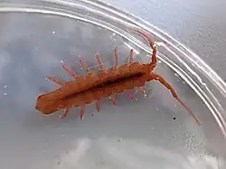 Adults reach 30 millimetres (1.2 in) in length. Body is red with a lightly coloured stripe down its back. The leading edge of each segment on the exoskeleton is curved towards its head. The tail section curves outwards.[1][3]