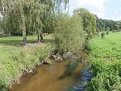 After collecting the Jordanbach in Kitzscher it turns from its hitherto predominantly northwesterly course to head in a southwestern to western direction. Flowing past Braußwig (a parish of Kitzscher), Dittmannsdorf (a parish of Kitzscher) and Eula (a parish of Borna), where since 2009[3] it has once more flowed for half a kilometre on its old, winding river bed, the river passes under the B 95 federal road. It then continues between Haubitz and the Witznitz Storage Basin and after 31 kilometres (19 mi) empties near Großzössen into the Wyhra, which then reaches its confluence with the Pleiße after just two more kilometres.