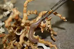 Eunice norvegica is an omnivore, predator and scavenger.[2] It often lives in association with deep water corals such as Lophelia pertusa. Other branching corals with which it associates include Madrepore and Solenosmilia. The worm wraps its tube around branches of the coral and this stimulates the coral to produce extra skeletal material which may overgrow the worm's tube.[3] This extra growth probably strengthens the coral and at the same time provides protection for the worm. It appears to be a mutualistic arrangement, the worm sometimes stealing food particles from the coral polyps, but also helping keep the coral surface clear of sediment.[4]