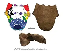 - ^ a b c d M. K. Vickaryous; A. P. Russell (2003). "A redescription of the skull of Euoplocephalus tutus (Archosauria: Ornithischia): a foundation for comparative and systematic studies of ankylosaurian dinosaurs". Zoological Journal of the Linnean Society. 137 (1): 157–86. doi:10.1046/j.1096-3642.2003.00045.x.