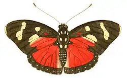 Upperside: Antennae black. Thorax and abdomen black, spotted with white. Anterior wings black, the tips edged with white; two pale lemon-coloured spots are situated in the centre of the wings, one being long, the other round; between which and the tips is a long lemon streak, extending from the anterior almost to the external edges; a large patch of a dull red is also placed on the hinder part of the wings, extending along the posterior edges from the shoulders almost to the lower corners. Posterior wings dull red coloured, bordered with black, whereon are seven small white spots placed along the external edges, and reaching from the upper to the abdominal corners. All the wings are dentated.