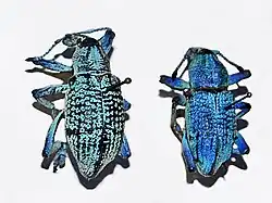 Eupholus azureus can reach a length of about 32 millimetres (1.3 in). The elytra are broader than the thorax at the base and pointed at the apex. There are nine rows of large regular deep punctures on each elytron. The scutellum is very small and round.[2] Eupholus azureus is slightly mottled black. The turquoise colour derives from very small scales.[3] The thorax shows two smooth black lines on each sides of the median sulcus. Usually there are one or two transverse bands (one is larger) a little behind the middle and not reaching the suture. The suture, the scutellar region and the transverse bands are black. Legs are azure and the knee joins are black. Antennae are partially covered with tiny whitish sensory hair, while the club is brown or black.[2] This species is characterized by sexual dimorphism, with males having a pronotum widely rounded and conical than females.